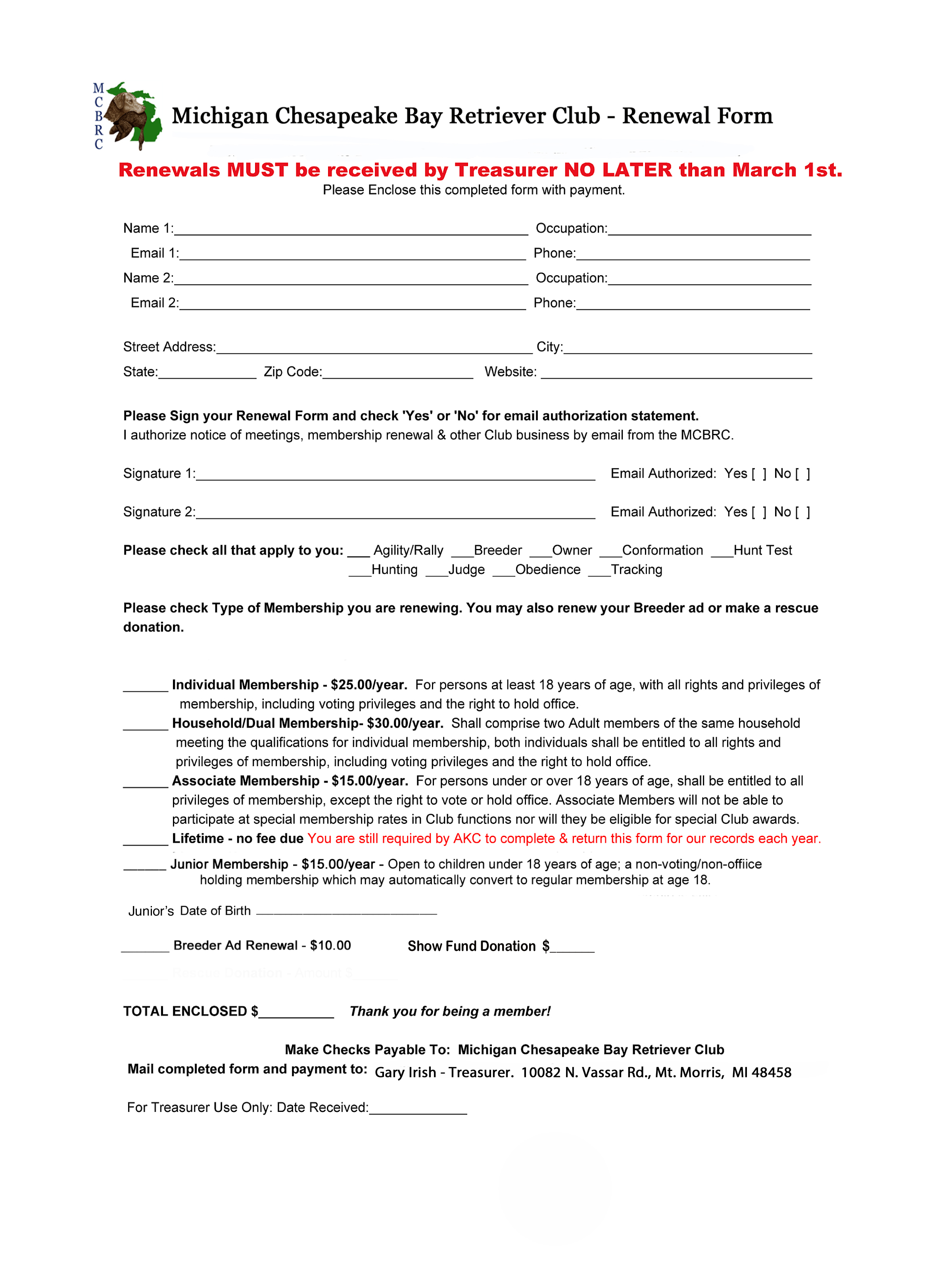 If you are not paying dues or making a donation, the form may be filled out and returned by email to mcbrc@yahoo.com
